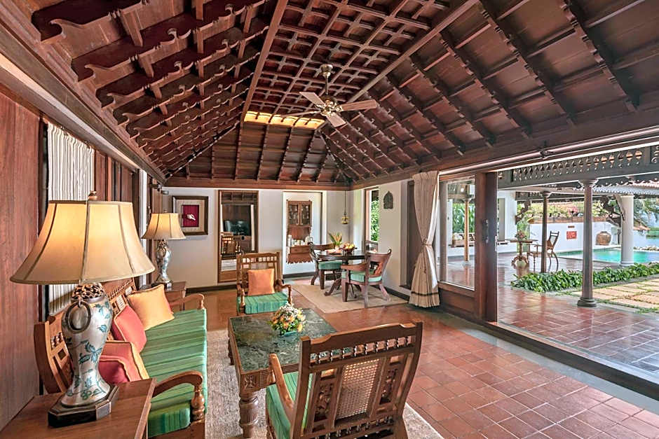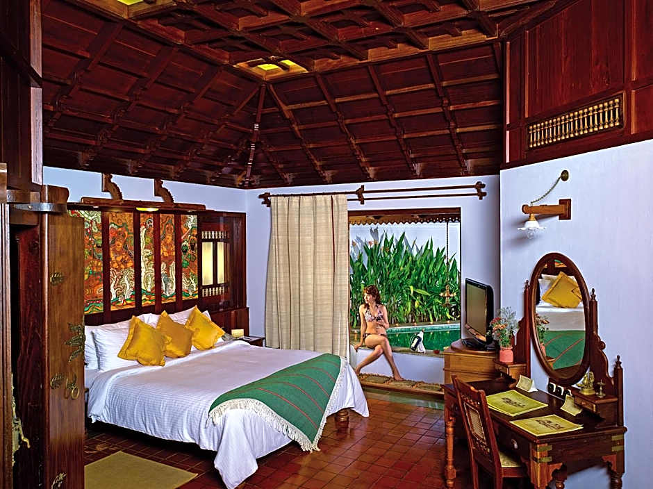 This spacious room designed in Kerala's traditional homestead style has its own private courtyard with a private pool and a spa tub. It features views of the gardens and the lotus ponds.